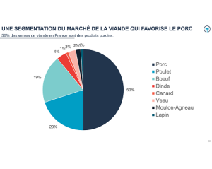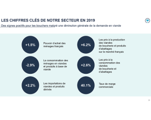 Il s’agit de plusieurs slides qui résument les principaux chiffres qui caractérisent le secteur de la boucherie : En France, nous pouvons compter plus de 15 000 entreprises dans le secteur de la boucherie, employant au total 40 000 personnes. En 2020, le chiffre d’affaires de ce secteur était de 7,085 milliards d’euros en France. Le secteur a été impacté positivement par la crise sanitaire avec un bond de 21% dans le chiffre d'affaires en 2020. En ce qui concerne la croissance à long terme, celle-ci est stable autour de 3%.